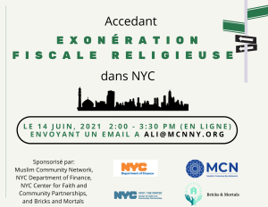Bricks and Mortals a co-organisé « Accéder aux exonérations fiscales religieuses à New York » avec le Muslim Community Network (MCN), le ministère des Finances de New York et le NYC Center for Faith and Community Partnerships le 14 juin à 14 heures. L’objectif de l’événement était de s’assurer que les FBO sachent comment appliquer et maintenir leur statut d’exonération fiscale à but non lucratif. Le webinaire était disponible en anglais et en français.