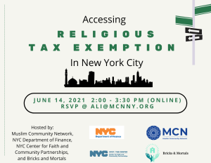 Bricks and Mortals co-hosted “Accessing Religious Tax Exemptions in NYC” along with the Muslim Community Network (MCN), the NYC Department of Finance, and the NYC Center for Faith and Community Partnerships on June 14th at 2 pm. The event goal was ensuring FBOs are aware of how to apply and maintain their non-profit tax exemption status. The webinar was available in English and French.